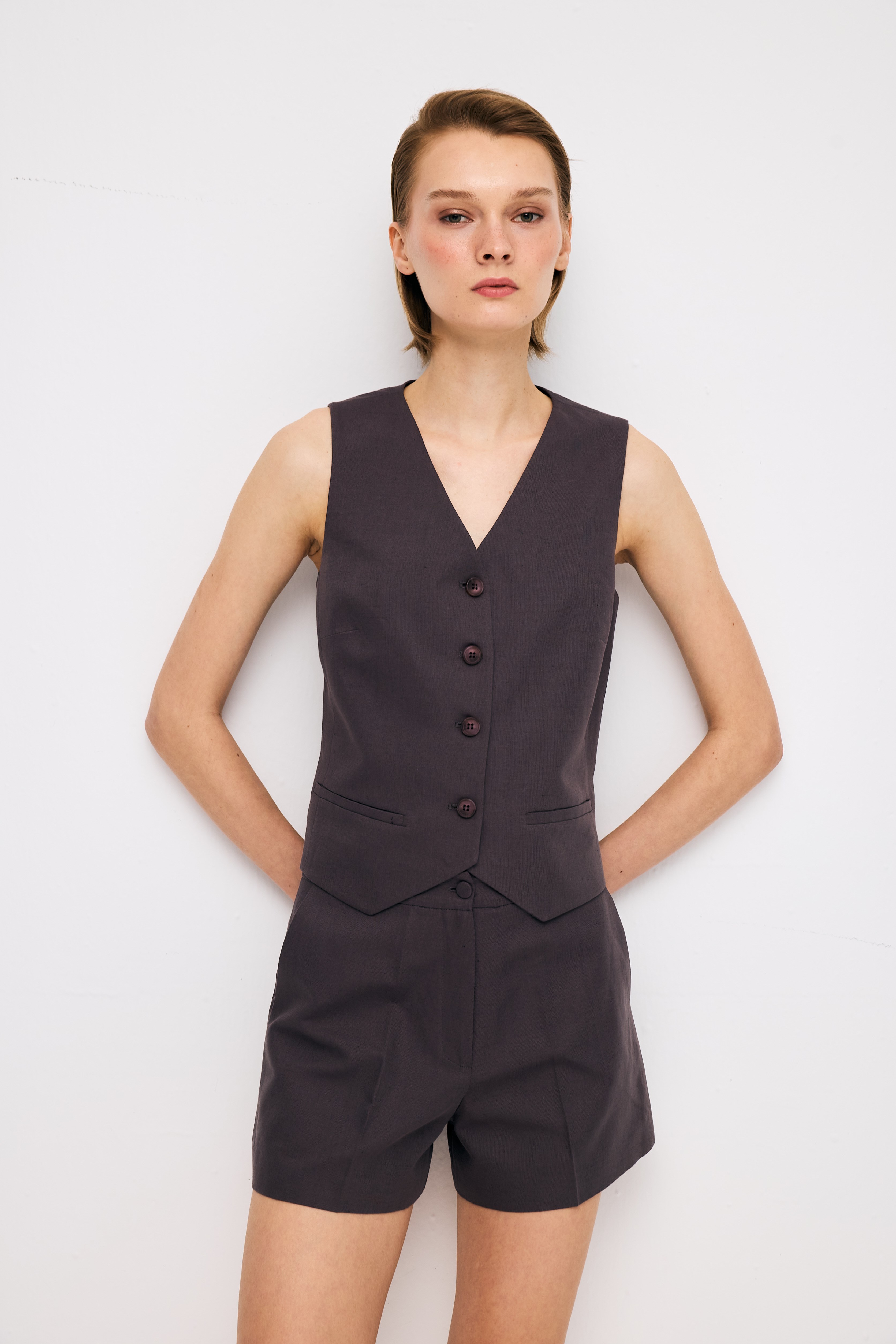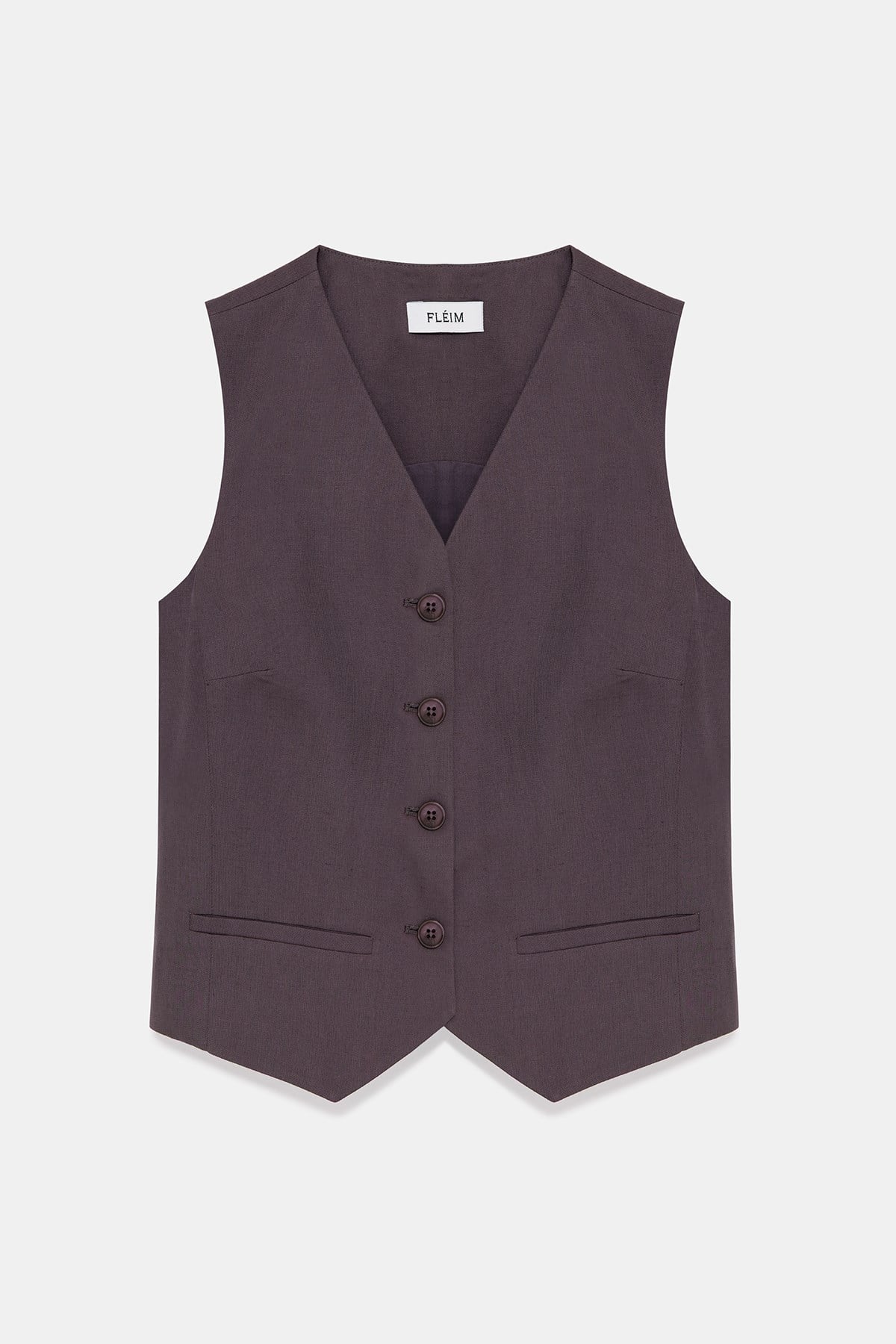 Vest; linenfabric, sleeveless tailored silhouette, V-neckline, front button closure, body-contouring fit, pointed hem detail, non-functional welt pockets, clean and structured finish.