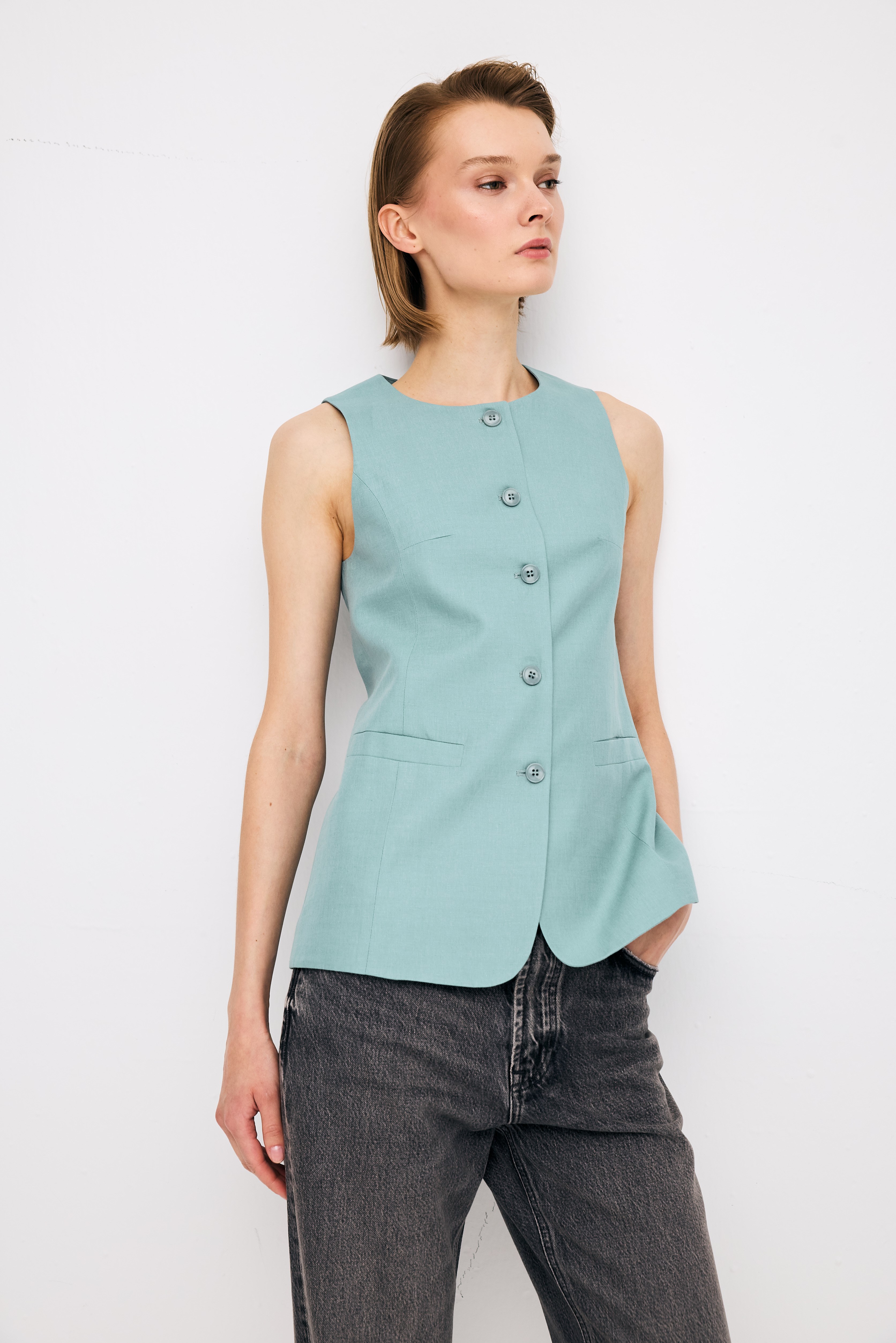 Vest; long linen vest with a back slit, crew neck, non-functional front welt pocket, full lined.