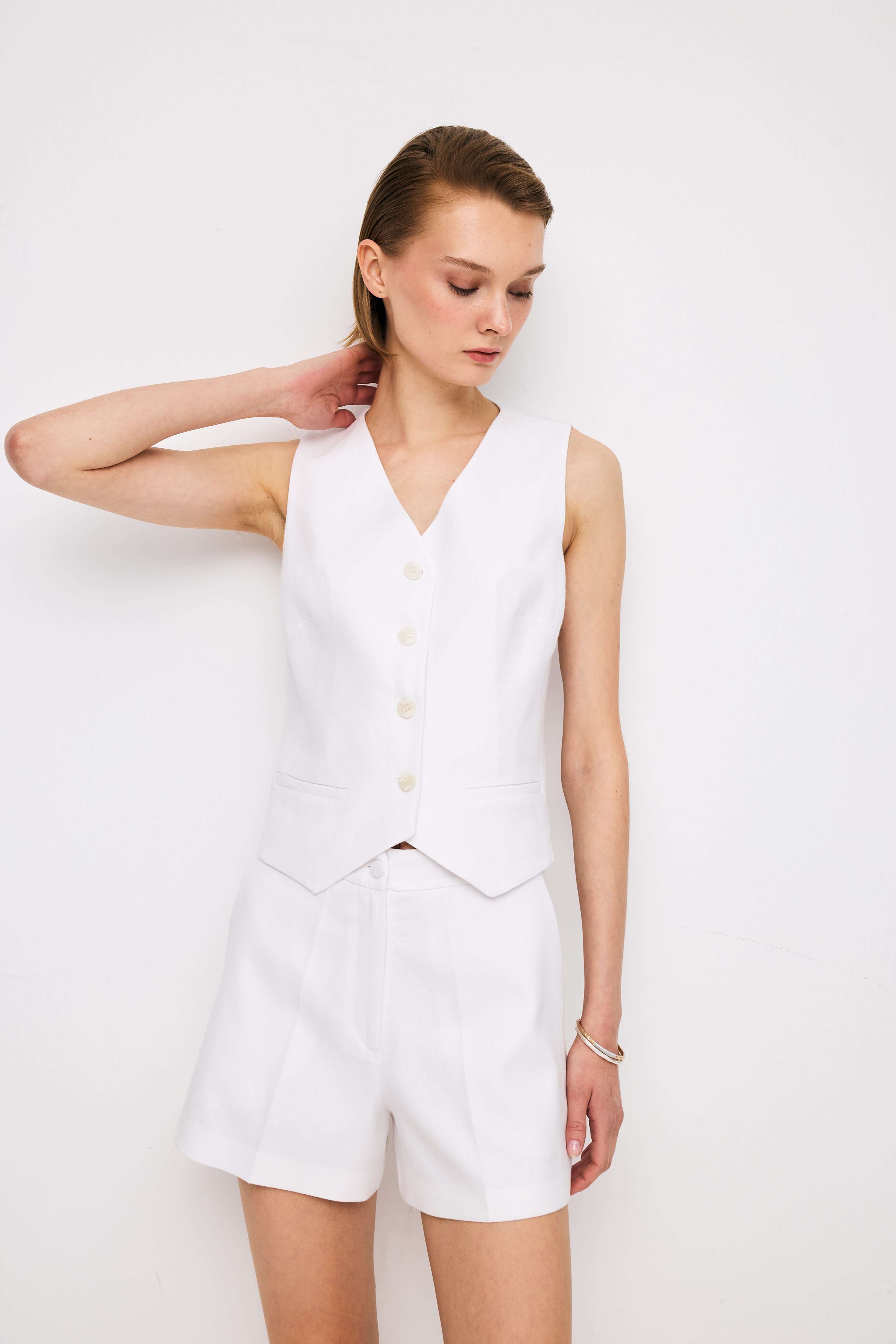 Vest; linenfabric, sleeveless tailored silhouette, V-neckline, front button closure, body-contouring fit, pointed hem detail, non-functional welt pockets, clean and structured finish. Vest length: 55 cm