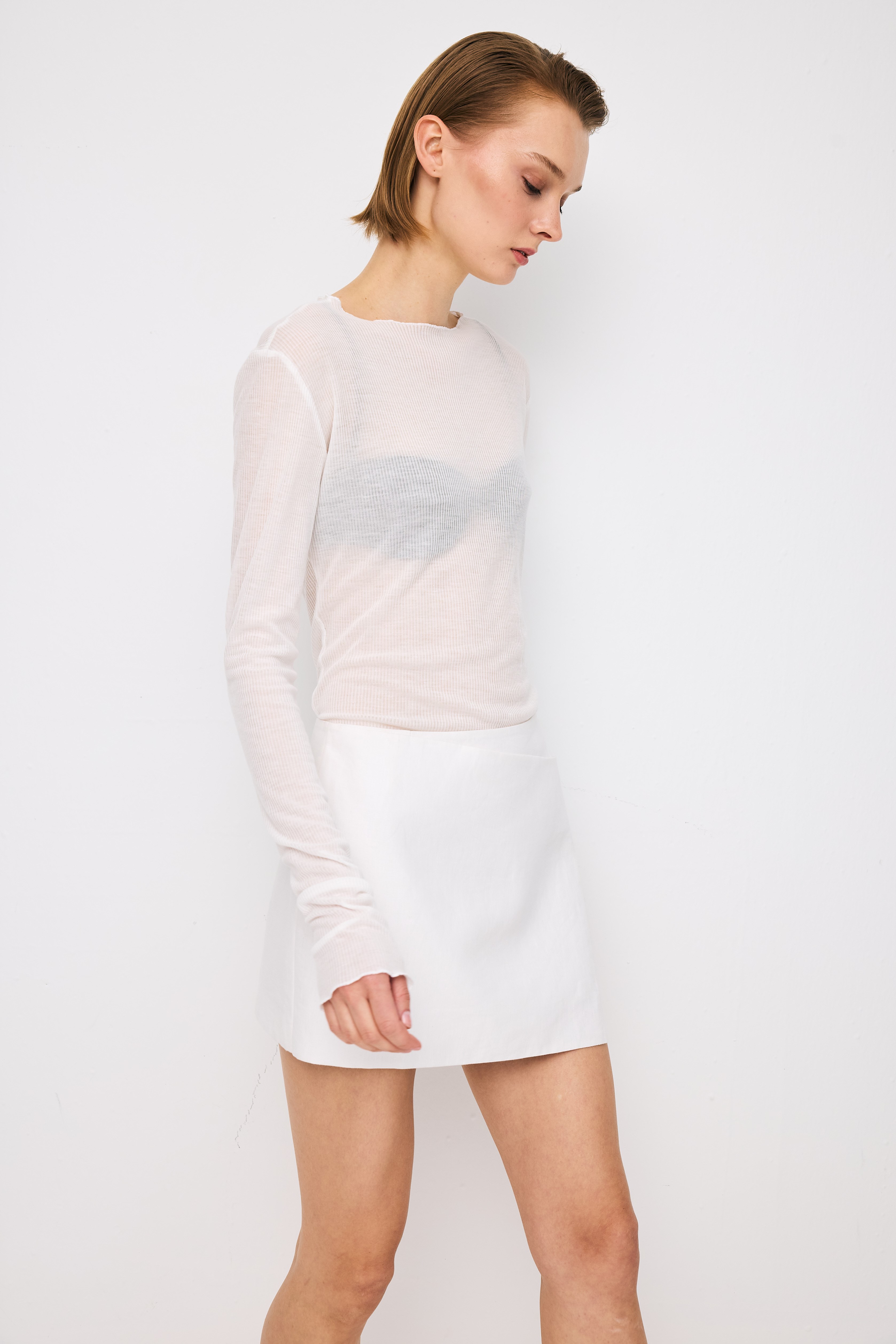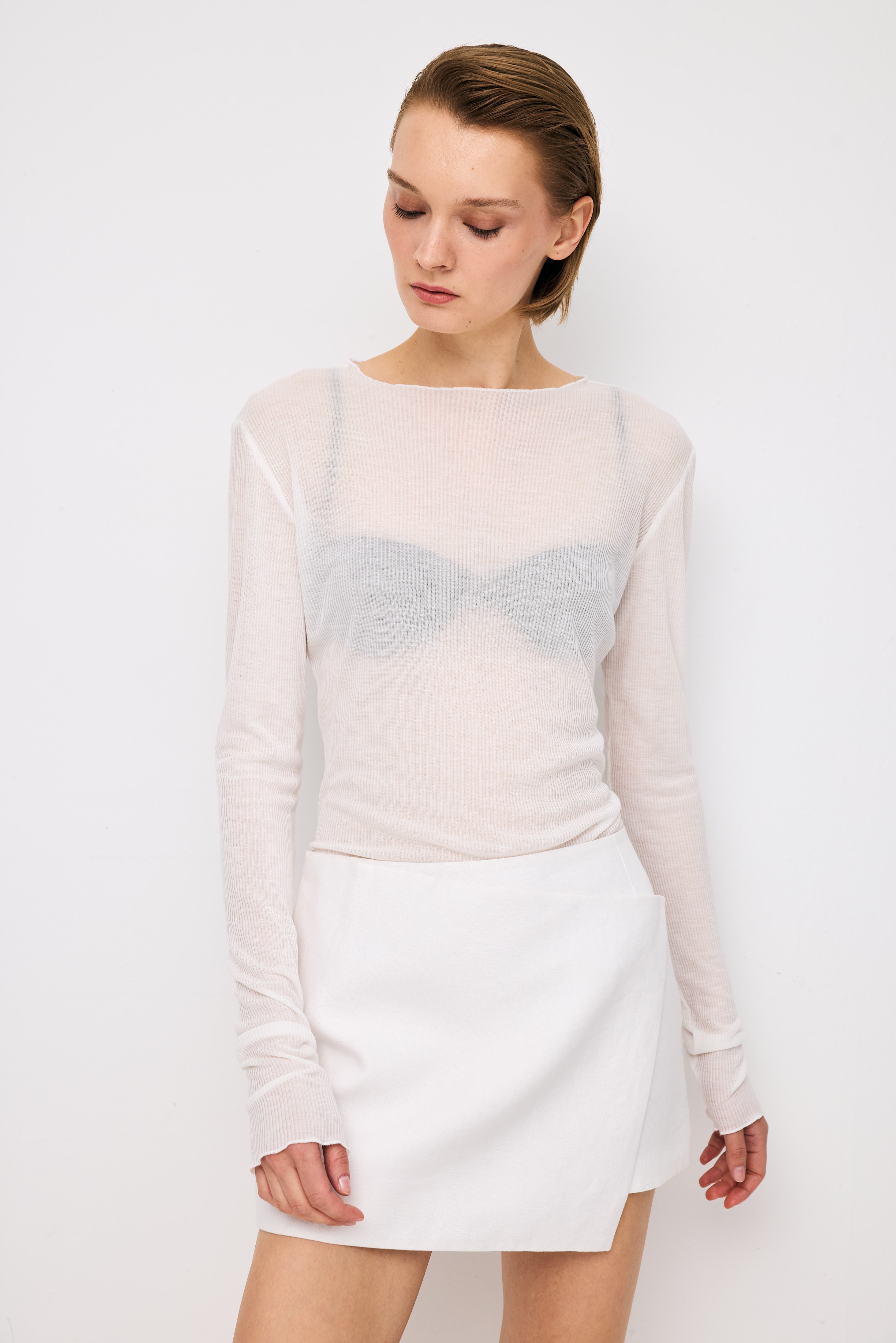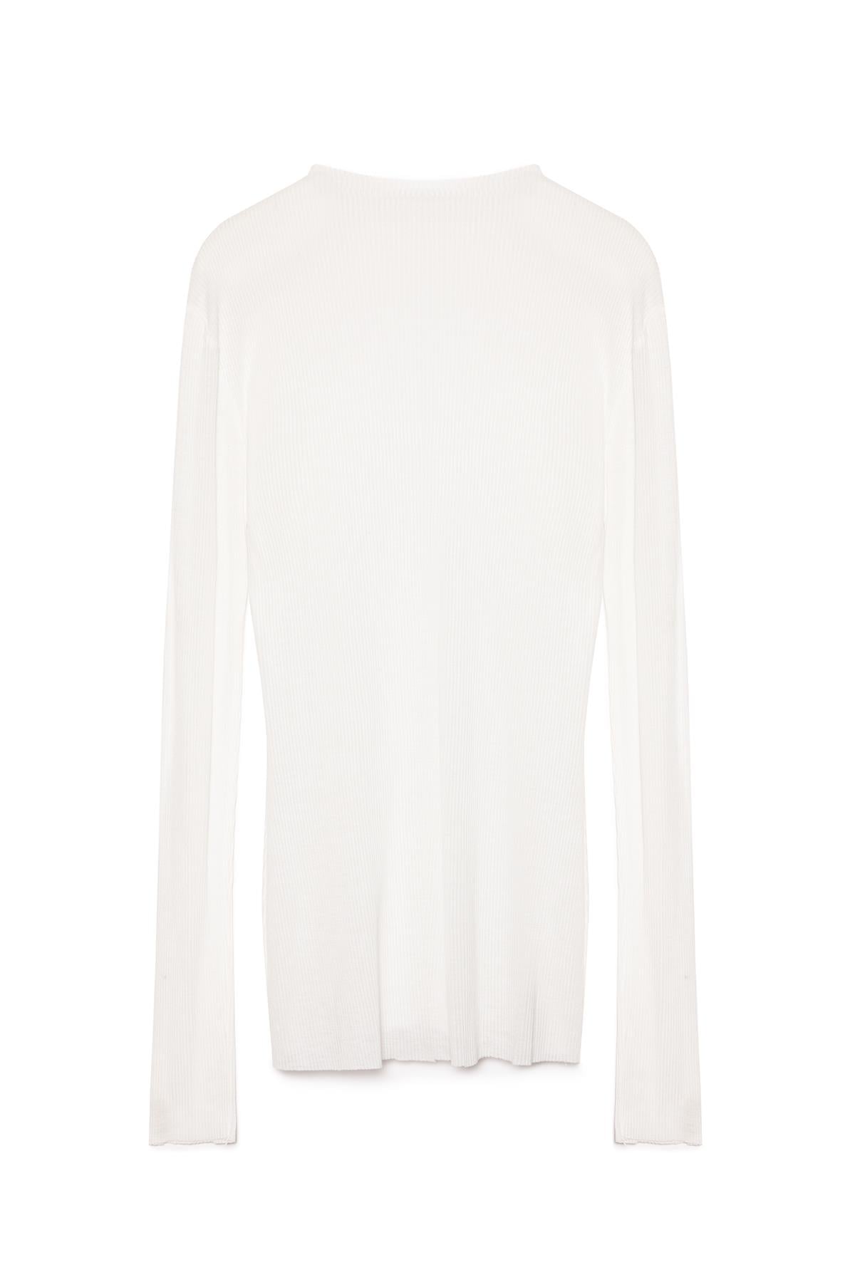 Blouse; soft white ribbed knit fabric, slim-fit silhouette, crew neckline, long sleeves, and clean hem finish. Blouse length: 64 cm
