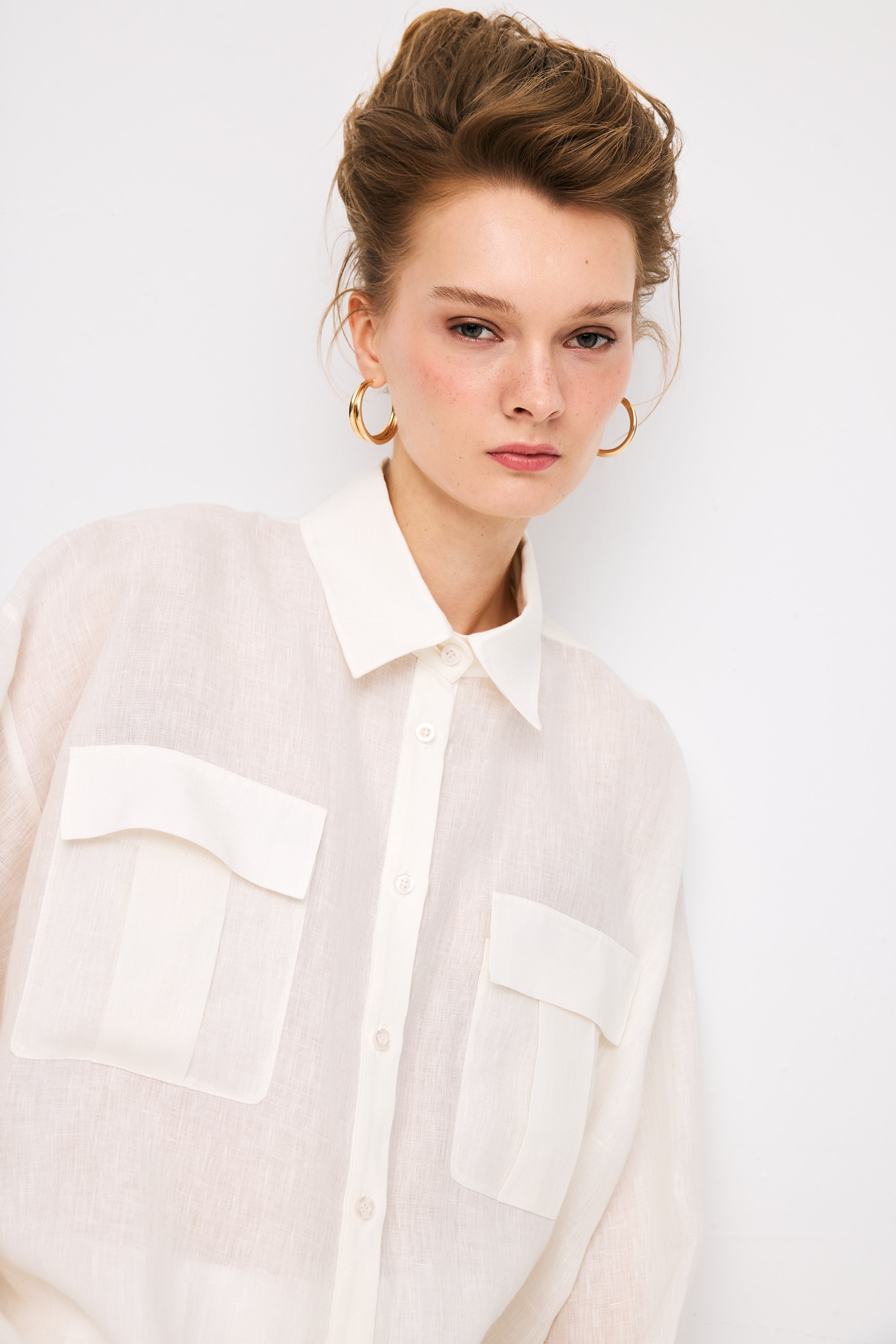 Shirt; lightweight semi-sheer fabric, classic point collar, long-sleeve silhouette, relaxed oversized fit, front button closure, double chest flap pockets, dropped shoulders, curved hem with a clean and minimal finish. Shirt length: 75 cm